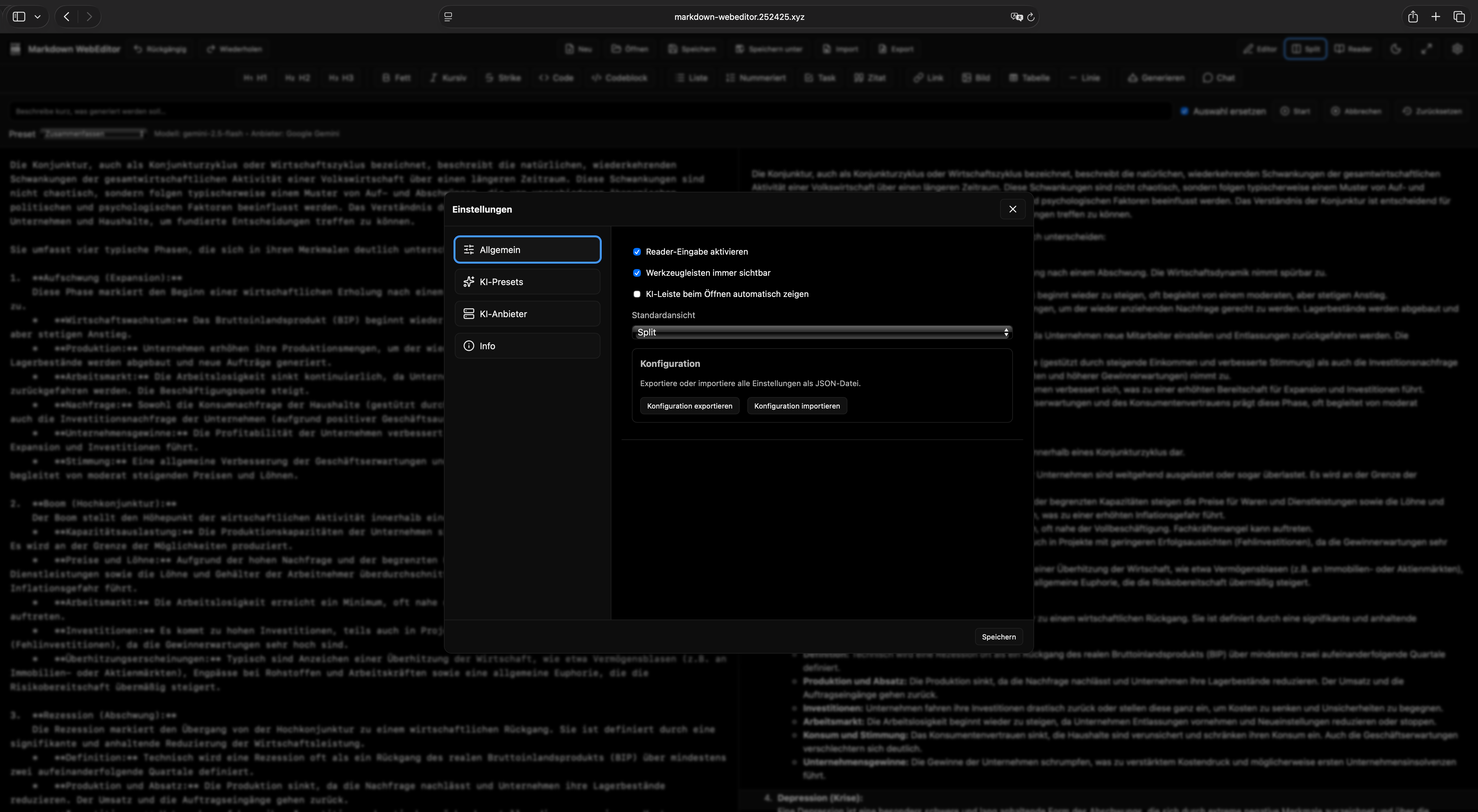 Hauptansicht: Editor, Toolbar und Live-Vorschau im Split-View.