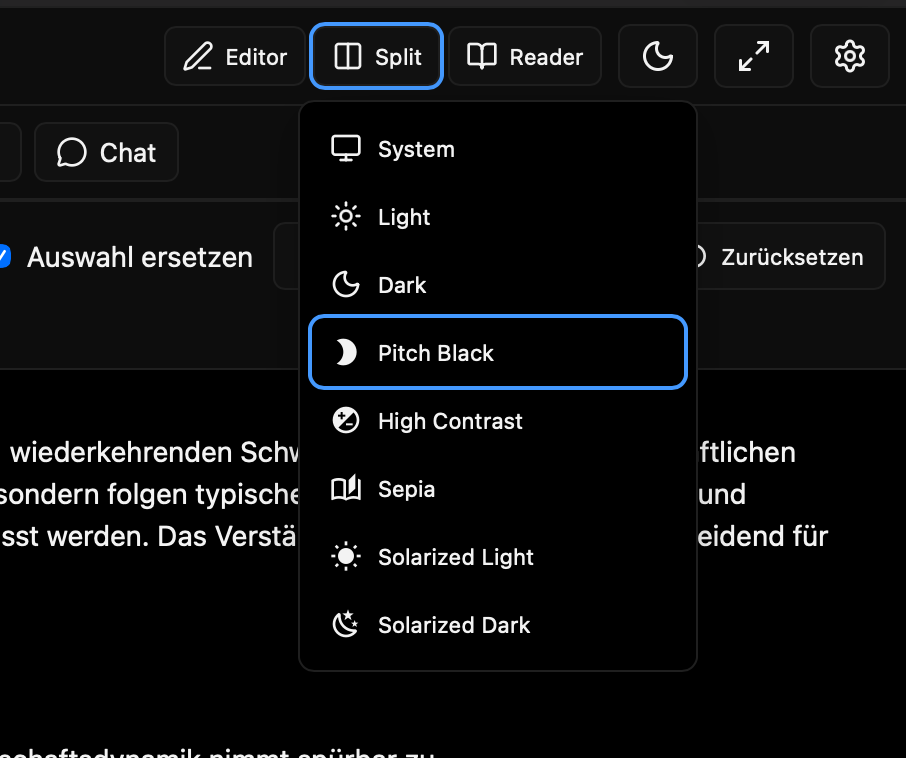 Ausgangspunkt war ein schlichter Dark/Light-Schalter, doch ich habe den Theme-Cycler erweitert: System, Light, Dark, Pitch Black, High Contrast, Sepia sowie Solarized Light/Dark stehen zur Verfügung. Beim Umschalten wechselt automatisch das passende highlight.js-Stylesheet, und der aktuelle Modus wird im lokalen Speicher gemerkt. Für Leserfreundlichkeit nutze ich CSS-Variablen, passe die Layout-Höhen dynamisch an und reagiere auf Fenstergrößenänderungen, damit Editor, Vorschau, Statusleiste und Chat sauber zusammenspielen.